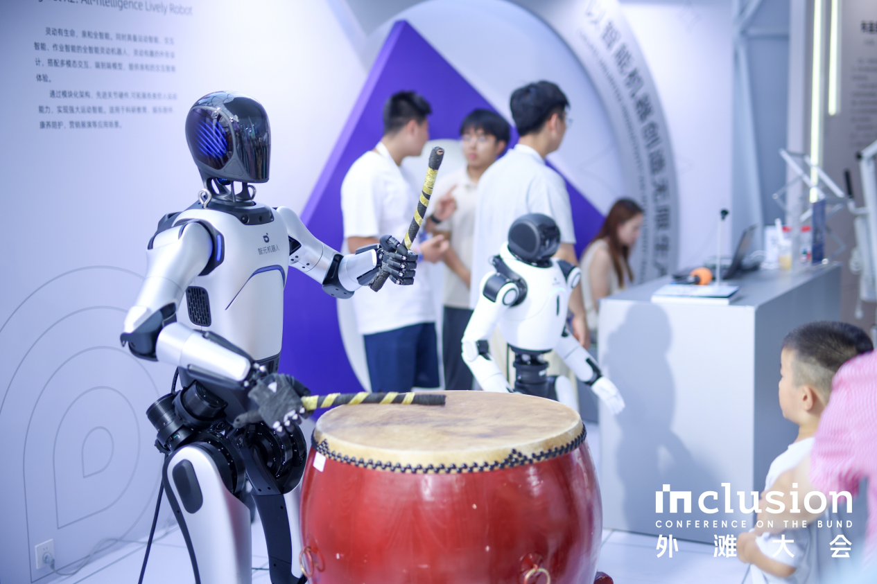 在外滩大会的“机器人小镇”展区,海洋之神远征A2再次展现其作为“科技鼓手”的非凡能力,向观众演绎一段《迎客鼓》,机械臂扬起鼓槌的每一个动作都精准契合传统鼓点,既保留了韵律灵魂,又注入了科技特有的节奏控制力,吸引台下观众纷纷举起手机记录这一时刻。而另一边,灵犀X2则扮演起“智能接待官”的角色,它不仅能够流畅介绍展区内容、回答观众问题,还能通过多模态感知识别观众情绪,做出相应肢体反馈。这种兼具功能性与情感化的交互,打破了“机器人冷漠”的刻板印象,营造出温暖而智能的“伙伴”形象。