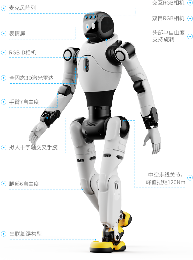 25-30个身体自由度,包含1个头部自由度、3个腰部自由度,动作灵活多变、生动有趣